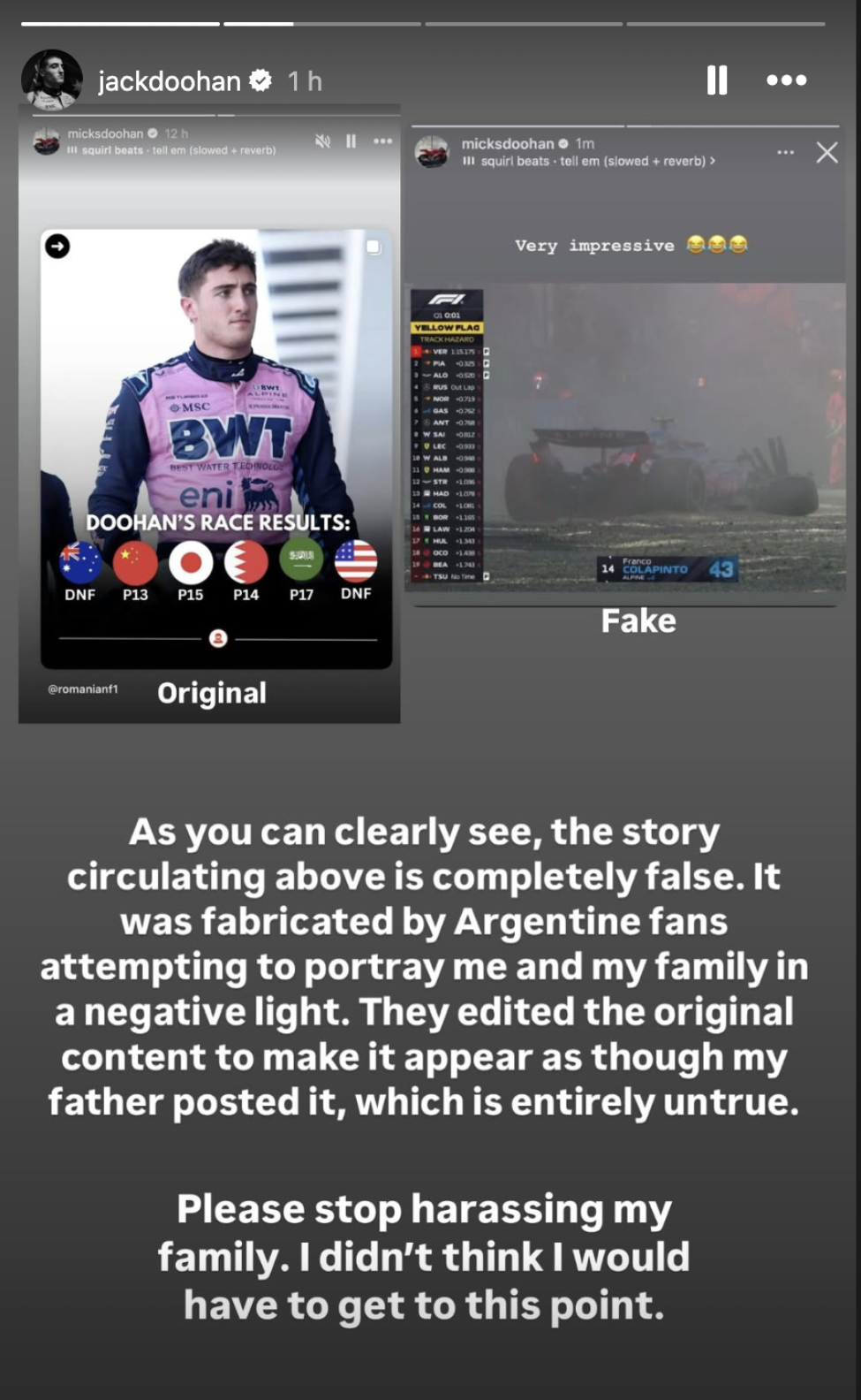 Doohan's first post featured an original social media story posted by his father, alongside a fake. It read: "As you can clearly see, the story circulating above is completely false. It was fabricated by Argentine fans attempting to portray me and my family in a negative light.