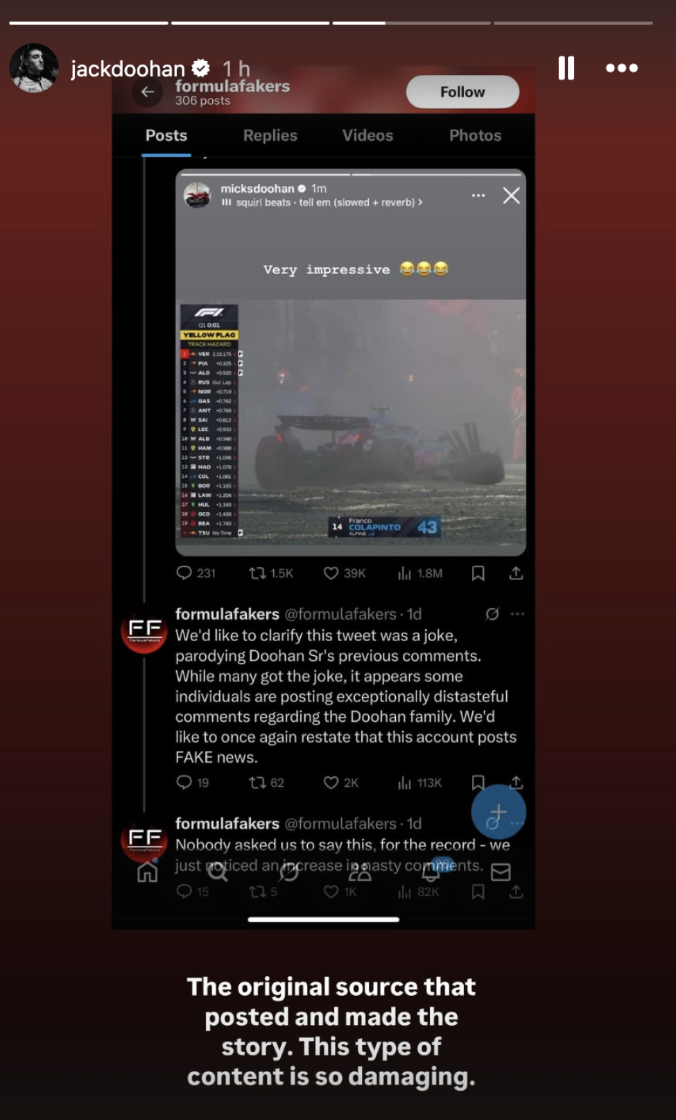 The second post showed a screenshot of the fake F1 news X account which revealed it was behind the post, and read: "The original source that posted and made the story. This type of content is so damaging."
