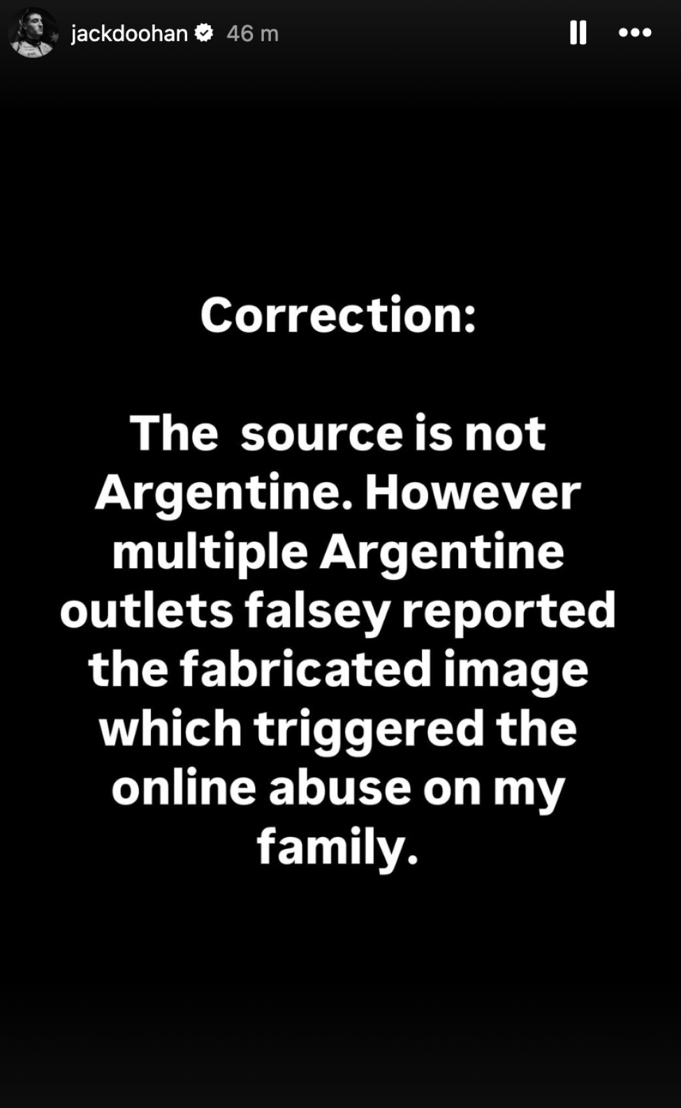 The final post was of Doohan correcting himself that the source of the fake posts was not Argentine, although criticised outlets from the nation which reported on them. It read: "Correction: The source is not Argentine.