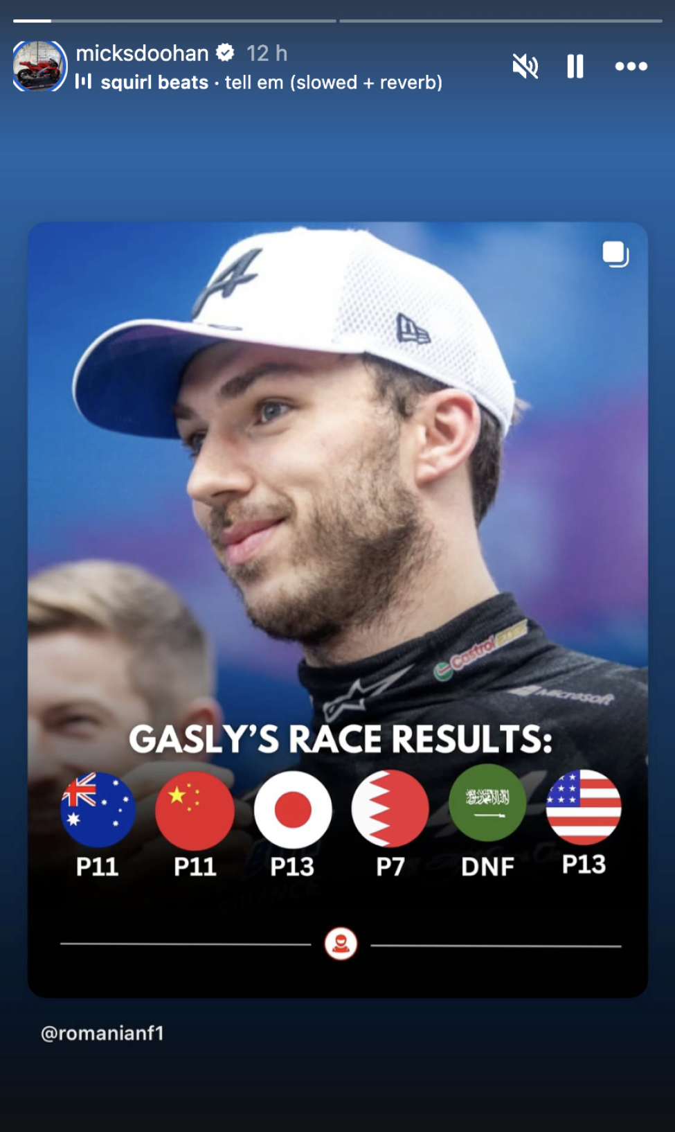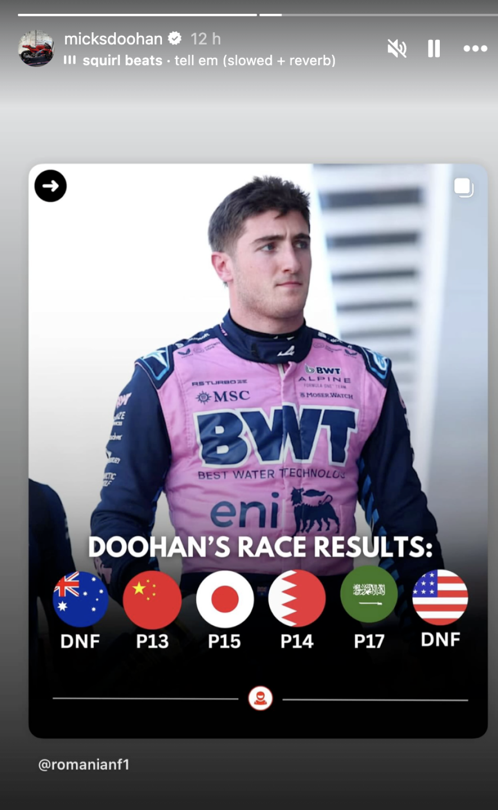 Following Doohan's demotion, his father has taken to social media by posting two Instagram stories, showing the results of Gasly and his son so far this season.