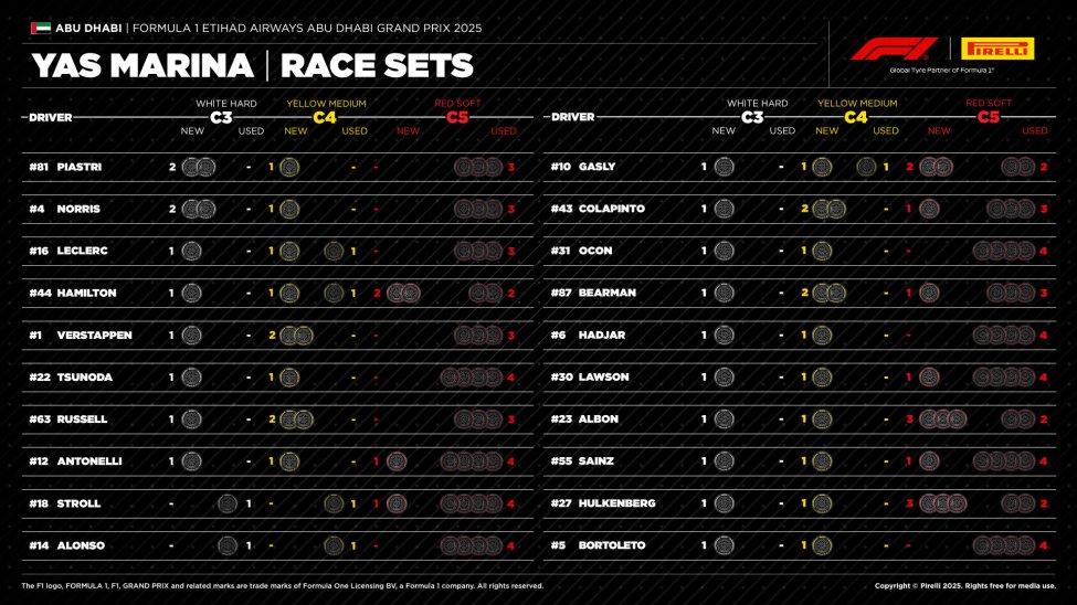 All three title contenders are likely to start on a new set of mediums, but Verstappen will then have in reserve another new set of the C4 rubber, which could benefit in the closing stages over McLaren's two C3 sets apiece.