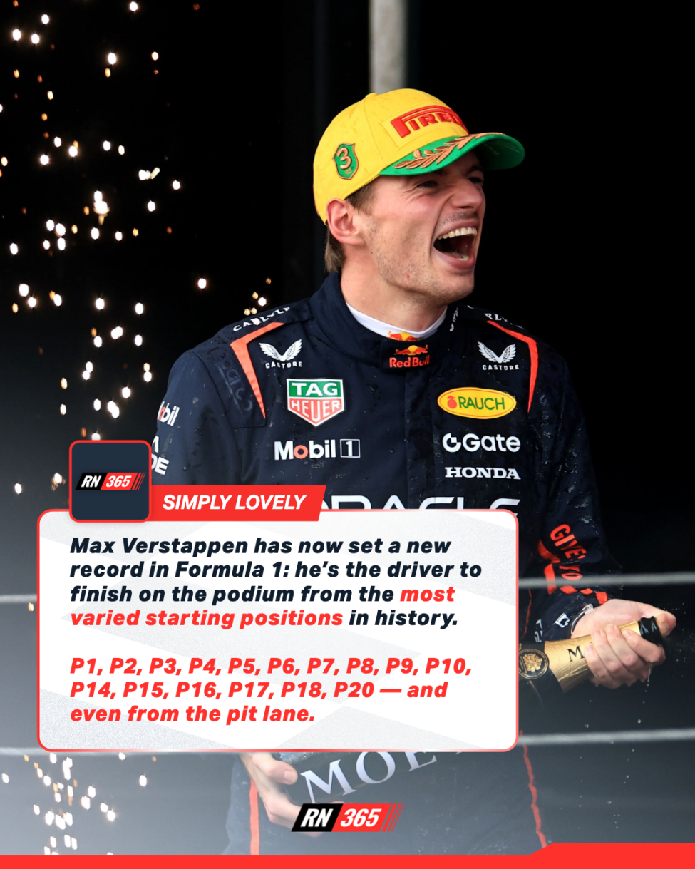 Verstappen is now the driver with podium finishes from the most different starting positions: 16 different grid slots and the pit lane, for a combined total of 17.